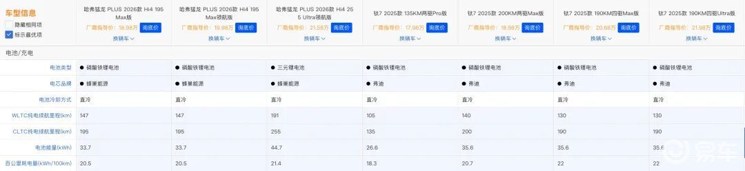 在纯电续航与能耗方面,猛龙PLUS实现全面领先,其提供195km、255km两档CLTC纯电续航可选,而钛7入门版CLTC纯电续航仅 135km,最高续航仅200km(两驱);亏电油耗上,猛龙PLUS WLTC 百公里亏电油耗仅6.2-6.35L,也优于钛7四驱版的6.4L/100km,日常用车成本更低。