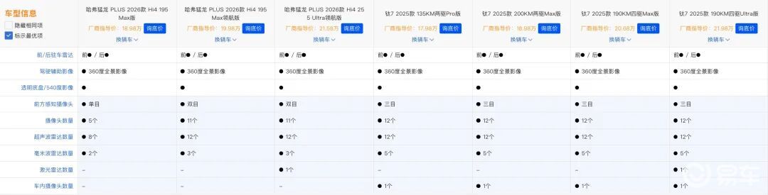 在智驾表现上,猛龙PLUS采用了Coffee Pilot 3,方程豹钛7采用了天神之眼B,两者的顶配车型均搭载了1颗激光雷达,硬件配置不相上下;而在非顶配车型上,方程豹钛7的感知硬件数量要多于猛龙PLUS。但硬件能力不绝对等于智驾表现,还是要看智驾软件能力,这要在后续进行实际体验比较才能知道哪个更好。