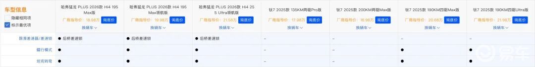 从核心产品力对比来看,猛龙PLUS和钛7两款车型各有侧重。对比来看,方程豹钛7的车身长宽和轴距略大于猛龙PLUS。在越野能力上,猛龙PLUS要更胜一筹。其全系标配后桥电控机械差速锁,全系标配长城Hi4智能四驱电混系统,越野的通过性上要更强。而钛7则提供前驱和四驱两种选择,四驱的售价来到了20万元以上,但是钛7搭载了云辇-C智能悬架,在过烂路时舒适性比较不错。