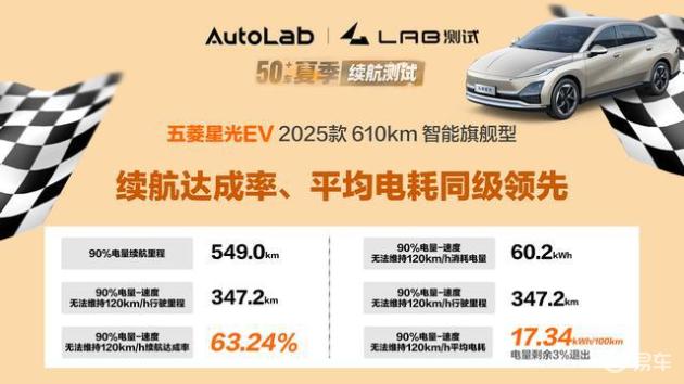 *数据来源于AutoLab夏季高环续航测试,系在特定条件下基于五菱星光EV 2025款610km智能旗舰型试验车辆测试得出,实际效果受车辆状态、试验场地特定环境等因素影响,会导致有所差异。