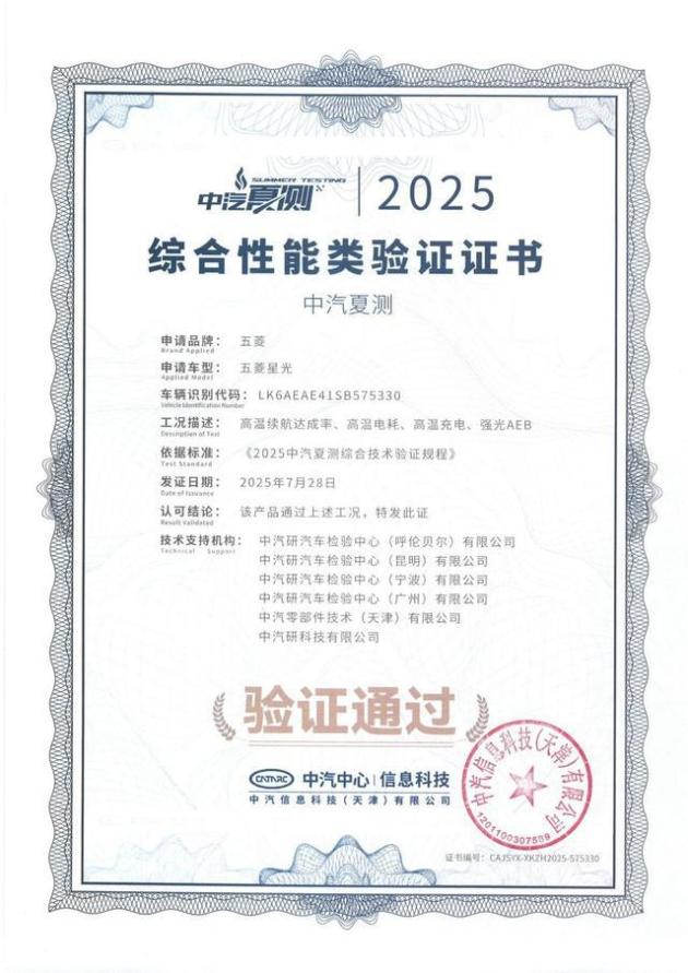 卓越成绩的背后,凝聚着五菱深厚技术积淀与对使用场景需求的精准把控。搭载69.2kW·h的神炼电池作为关键支撑点,成功通过针刺、浸水等多项严苛考验,性能远超国家标准,彻底杜绝起火爆炸风险,即便在高温工况下也能保持能量输出稳定,为持久续航打下坚实基础;整车采用0.228Cd超低风阻造型设计,借助流线型车身与空气动力学精细调校,显著降低高速行驶过程中的能量损耗,使每一度电能都高效转化为实际行驶里程。低能耗与高稳定性的双重优势,切实消除了用户对于高速路况下续航缩水的顾虑,为夏日出行保驾护航。尤为突出的是,五菱星光2025款纯电版此前参与中汽夏季测试时已充分彰显综合实力——在45℃极端高温环境中实现90.74%的续航达成率,应用2C快充技术实现快速补能,配备的灵眸智驾系统更能在强光照射条件下精准护航,最终斩获综合性能类权威认证证书。