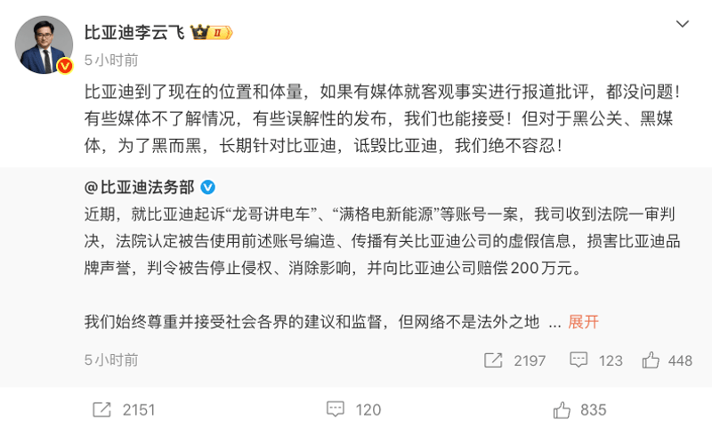 比亚迪集团品牌及公关处总经理李云飞表示,比亚迪到了现在的位置和体量,如果有媒体就客观事实进行报道批评,都没问题!有些媒体不了解情况,有些误解性的发布,我们也能接受!但对于黑公关、黑媒体,为了黑而黑,长期针对比亚迪,诋毁比亚迪,我们绝不容忍!