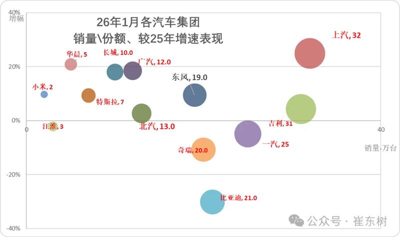 车讯 日前,乘联分会秘书长崔东树发布《2026年1月份汽车细分市场走势和厂家竞争表现分析》。1月厂家销量增速相对较好。1月新能源车走势较平稳,主要原因是汽车出口市场持续走强。