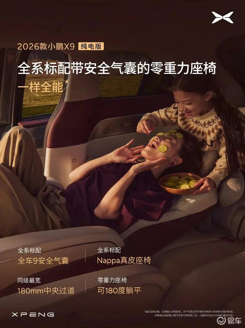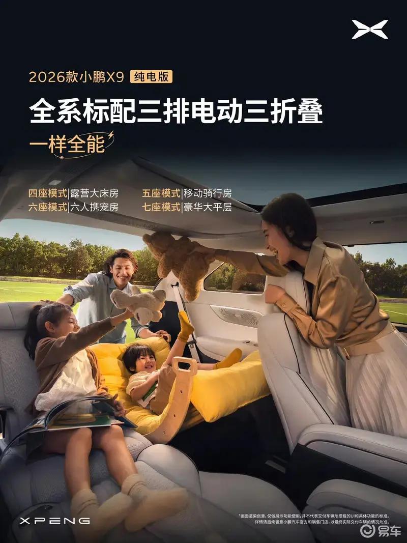 座椅方面,2026款小鹏X9纯电版全系标配三排电动三折叠,提供四座模式、五座模式、六座模式、七座模式。其余配置方面,新车全系标配Nappa真皮座椅、带安全气囊的零重力座椅(可180度躺平)、9安全气囊、爆胎稳行系统。