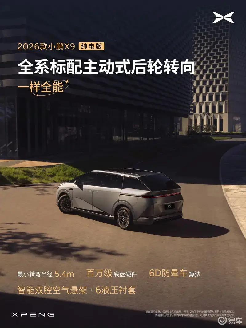 动力方面,2026款小鹏X9纯电版全系标配800V高压平台+5C超充AI电池,CLTC纯电续航750km,CLTC综合电耗15.9kWh/100km。此外,新车全系标配主动式后轮转向,最小转弯半径5.4m,并全系标配RNC降噪。底盘方面,新车搭载智能双腔空气悬架+6液压衬套。