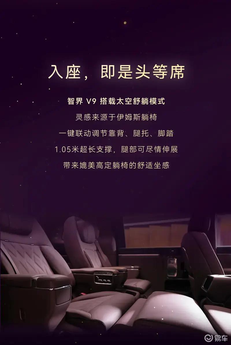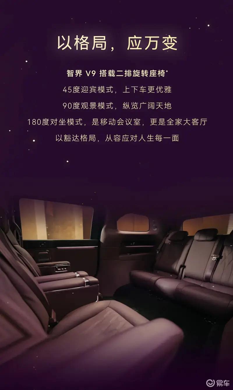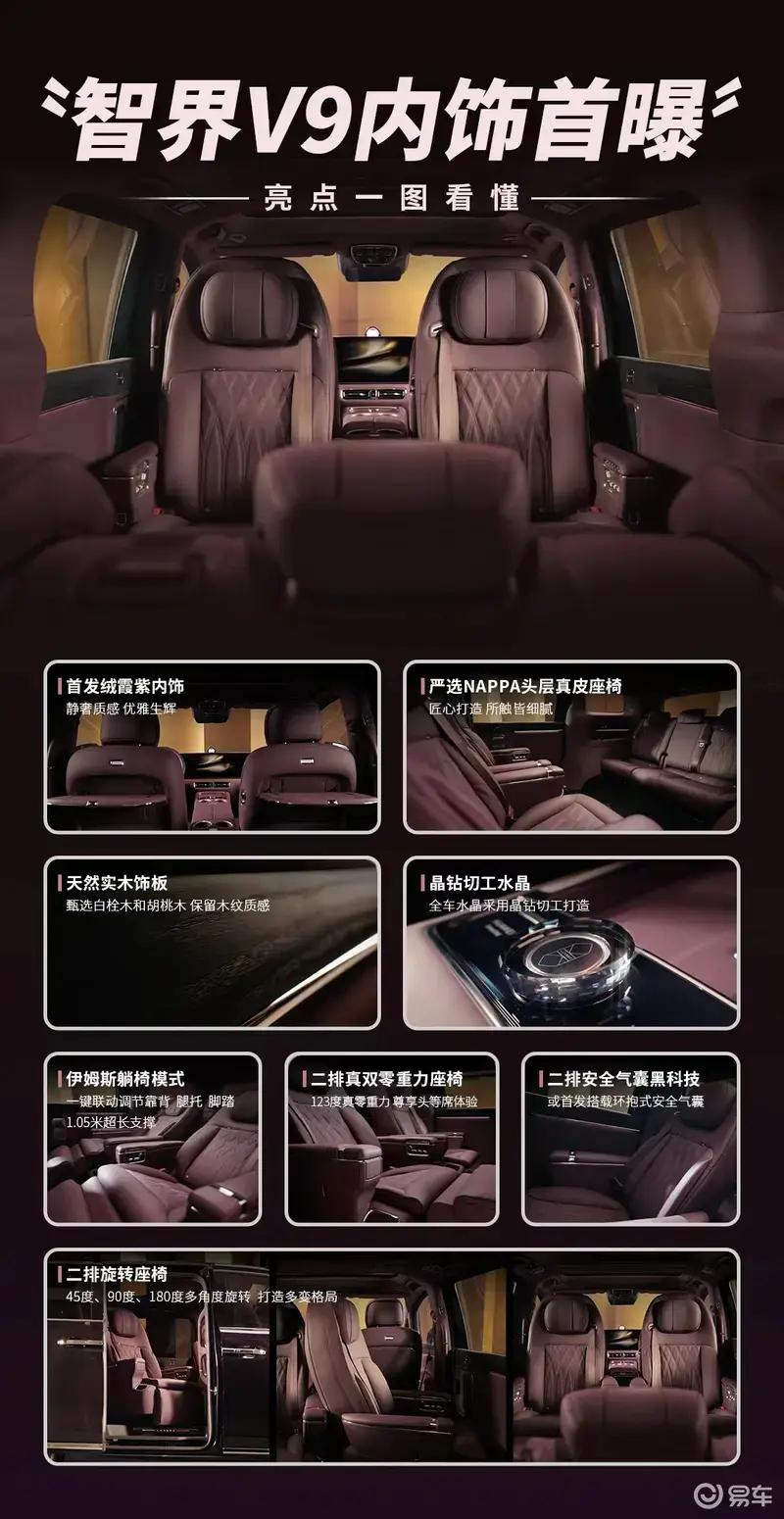 智界V9首发绒霞紫内饰,选用天然实木、NAPPA头层真皮与晶钻切工水晶等高端材质,豪华质感拉满。此外,新车还搭载二排旋转座椅、太空舒躺模式及零重力座椅模式等智能科技配置。
