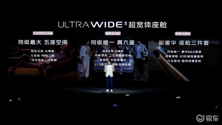 空间与豪华感上,Ultra Wide³超宽体座舱带来同级最强大空间,大五座版二排媲美行政MPV,六座版第三排不将就,大四座模式搭配21.5英寸吸顶屏打造影院级体验。“柯布西耶”沙发椅拥有132°大躺角与SPA级按摩,后备箱可轻松放下6个28寸行李箱。百万级“新奢华三件套”——B&O音响、4D机械按摩座椅、智控地暖系统全系标配。