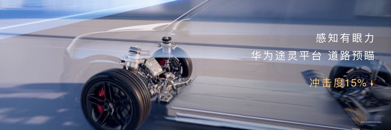 全系标配华为途灵平台,前双叉臂、后五连杆独立悬架,搭配闭式空气悬架与连续可变阻尼减震器,行驶更舒适。前四活塞固定式刹车卡钳[5],百零刹停距离仅33.8m[6]。道路预瞄,冲击感降低15%[7];HUAWEI DATS 3.0使打滑风险降低60%[8]。御水缓行模式应急涉水深度700mm。搭载猫头鹰极致转向,最小转弯半径5.5m。