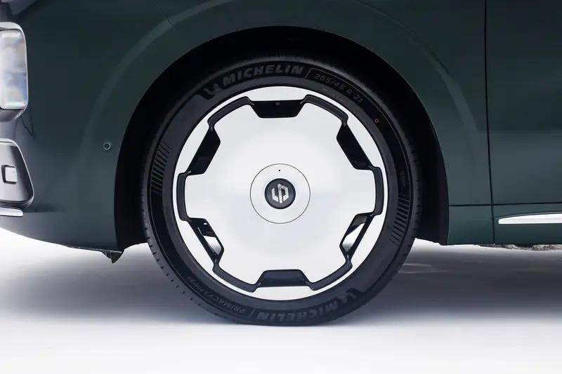 车身侧面,新车整体较为简洁大气。采用了研发投入高达2000万元的天空之镜纯平侧窗。此外新车还搭载21英寸向往之境轮毂和米其林高性能静音轮胎。