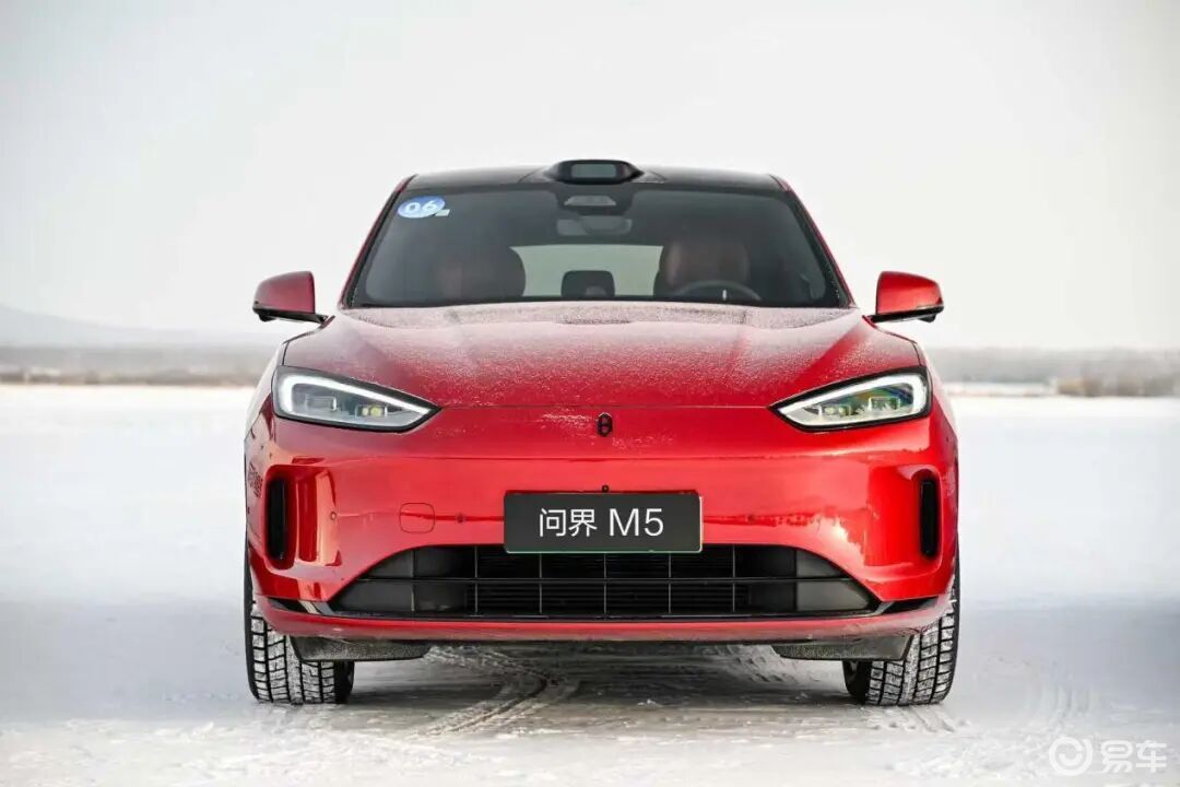 来到车身侧面,较为流畅的线条,整体轮廓更靠近问界M7,尺寸方面,介于问界M5和问界M7之间,新车采用双五辐式亮黑色轮圈内部搭配红色刹车卡钳,采用半隐藏式车门把手。