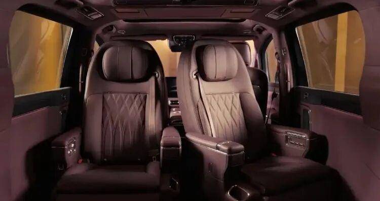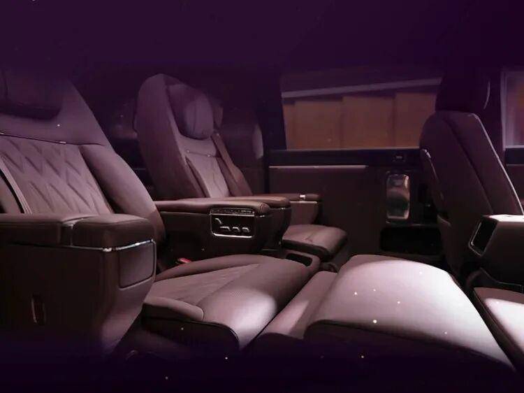 新车采用2+2+3的7座布局,二排两张独立的123度双零重力座椅看着相当豪横,可以一键联动调节靠背、腿托、脚踏,达到1.05米的超长支撑。二排配有吸顶屏,小桌板等配置,座椅扶手内侧还预留了一些实体按键。值得一提的是,其二排座椅还可以旋转,根据不同场景,实现45度迎宾,90度观景和180度对坐模式。