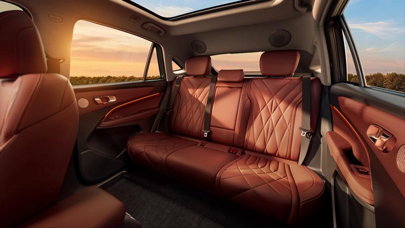 内饰方面,新车内饰采用极简环抱式对称布局,线条由门板自然延展至中控,营造出开阔温馨的包裹感。车内采用大面积的皮质包覆和菱形缝线,钢琴黑饰板与指尖涡流触感旋钮点缀其间。