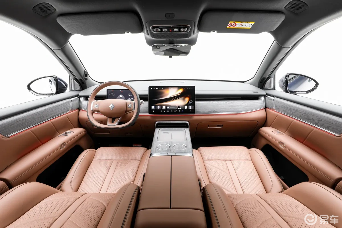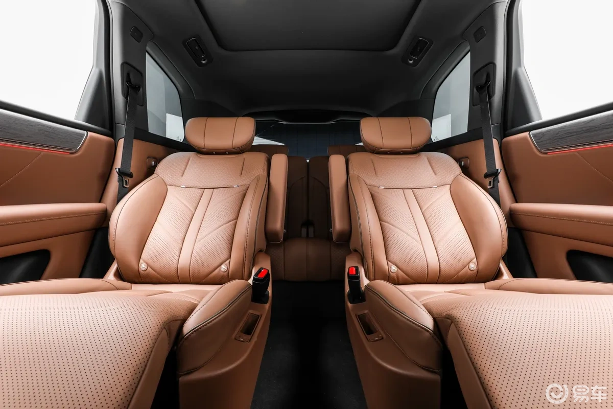 内饰采用环抱式座舱布局,车内配备液晶仪表与悬浮式中控屏,构成基础的智能交互界面,屏幕下方设置了无线手机充电板与双杯架,实用性配置布局合理。座椅布局为2+2+2式的大六座形式,第二排座椅配备独立腿托,同时后排还搭载吸顶娱乐屏、二排小桌板等配置,能够满足家庭出行时的舒适性与娱乐需求。